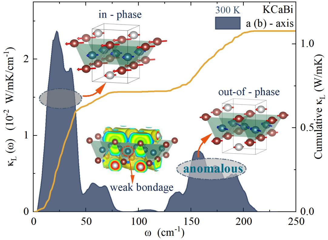 热导率是用来表征材料在有限温度梯度下传热能力的指标,在热电、光电子、热管理、热障涂层等领域具有重要意义。热传递通常可以用声子气体模型来描述,即认为材料中的热传递与原子振动有关。但占据高频位置的光学声子一般具有低声子群速度和短弛豫时间,这导致其对热传递的贡献极小。作者的研究发现,KXY (X=Ca, Mg; Y=Sb, Bi)材料存在着异常传热的光学声子,其光学声子对总热导率的贡献约占45%。在通过自洽声子理论、压缩感知技术充分处理晶格高阶非谐性、捕获精确热输运结果的基础上,作者结合电子局域密度函数、巴丁电荷密度、布局数分析、可视化的原子振动模式等多重结果验证剖析了这种现象产生的微观机制。结果表明,材料中的高频光学声子具有高群速度和低散射相空间,而材料四面体构型的特殊成键环境是导致这种异常光学声子的根本原因。这项工作有利于研究者更好的理解材料传热行为的微观起源同时也为人工调控输运性质提供了新的方案。