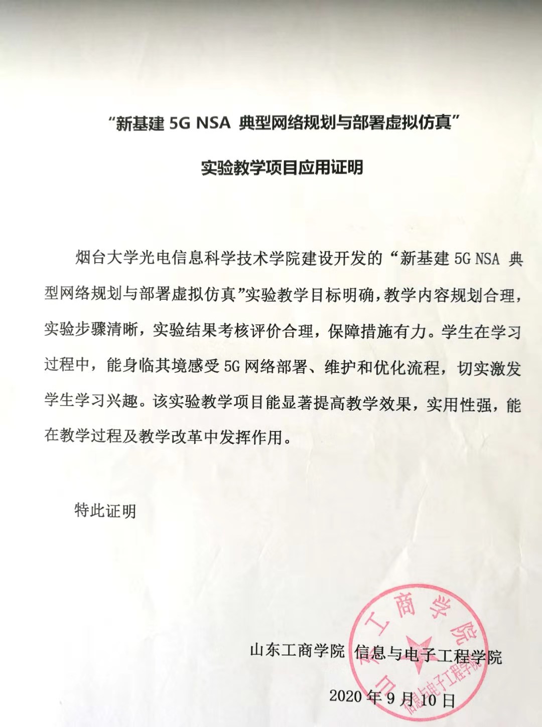 山东工商学院信息与电子工程学院推广应用证明: